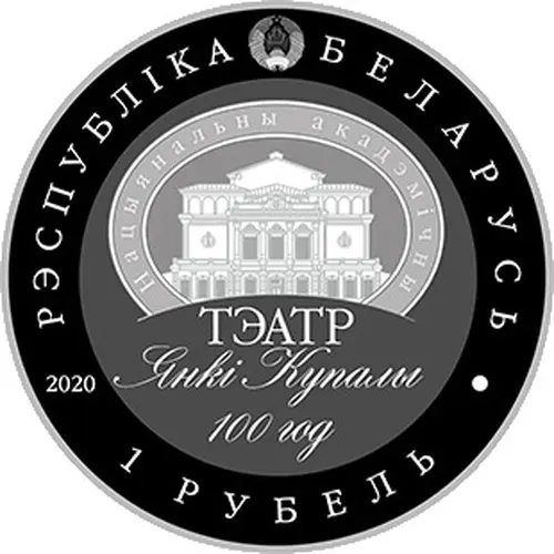 | Beschrijving voorzijde | Top - the relief of the State Coat of Arms of the Republic of Belarus. Center – Logo of Yanka Kupala National theater with the inscription in three lines `ТЭАТР Янкі Купалы 100 год (Yanka Kupala theater 100 years) Along the rim- at top position `РЭСПУБЛІКА БЕЛАРУСЬ` (Republic of Belarus), at the bottom `1 РУБЕЛЬ` (1 Ruble), on the left: 2020 |