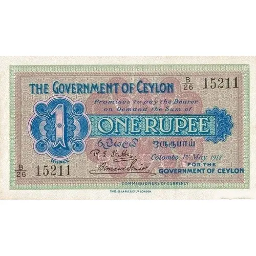 | Obverse lettering | THE GOVERNMENT OF CEYLON Promises to pay the Bearer on Demand the Sum of ONE RUPEE රුපියලයි ஒரு ரூபாய் Colombo, 1st May 1917 FOR THE GOVERNMENT OF CEYLON COMMISSIONER OF CURRENCY |