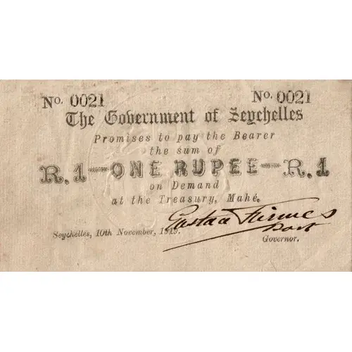 | Obverse lettering | The Goverment of Seychelles Promises to pay the Bearer the sum of R. 1 - ONE RUPEE - R.1 on Demand at the Treasury, Mahé Seychelles, 10th November, 1919. |