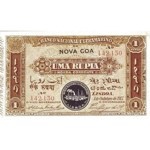 | Obverse lettering | BANCA NACIONAL ULTRAMARINO NOVA GOA UMA RUPIA MOEDA CORRENTE |