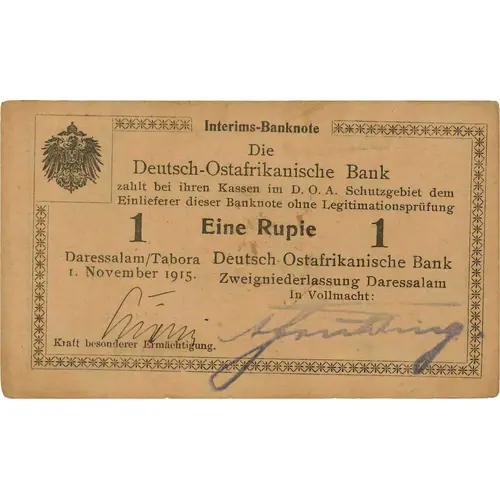 | Описание лицевой стороны | Eagle at upper left. With text `Kraft besonderer Ermächtigung` below signature at left. Stamped signature at right |