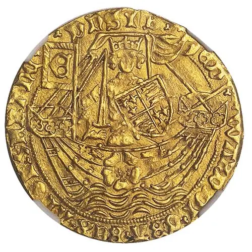 | Obverse description | King Edward IV standing facing, holding sword and shield, in ship with bowsprit, Є on banner on stern, rose on hull. |