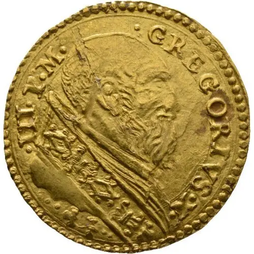 GREGORIVS ٠ X ٠ III ٠ P ٠ M (Translation: Gregory 13th Supreme Pontiff) |