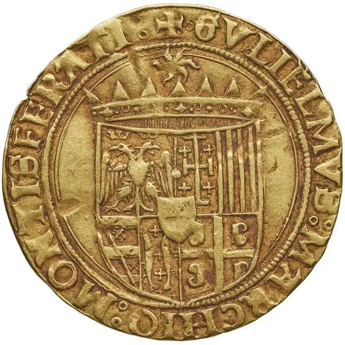 Crowned shield of 4-fold arms, with central shield of Casale, curved rayed sun above. |