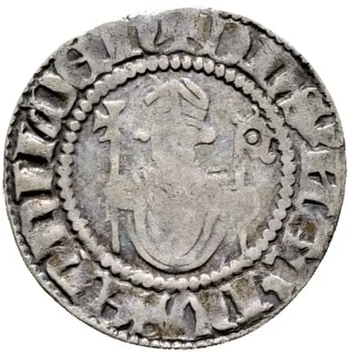 | Beschrijving keerzijde | Shielded arms within beaded circle, legend surrounding. |