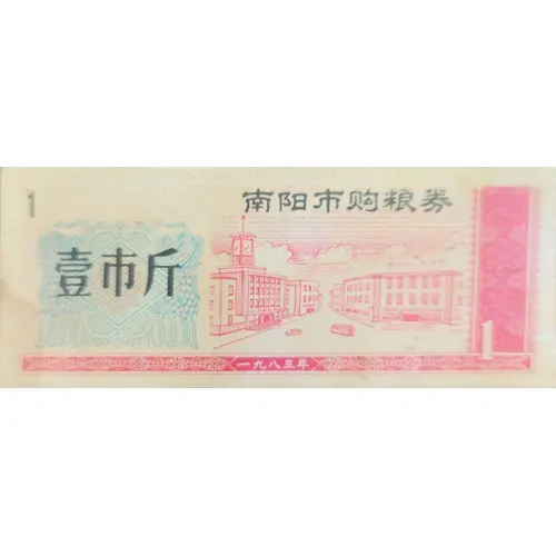 | Obverse lettering | 南阳市购粮券 壹市斤 一九八三年 (Translation: Nanyang City food stamp 1 Shi Jin (500 Grams) 1983) |
