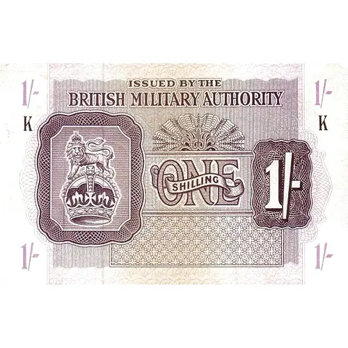 | Obverse lettering | ISSUED BY THE BRITISH MILITARY AUTHORITY ONE SHILLING 1/- |