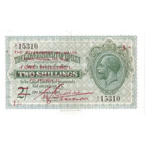 | Obverse lettering | THE GOVERNMENT OF MALTA Hereby declares this Note -( ONE SHILLING )- to be legal tender for payments not exceeding £2 |