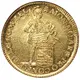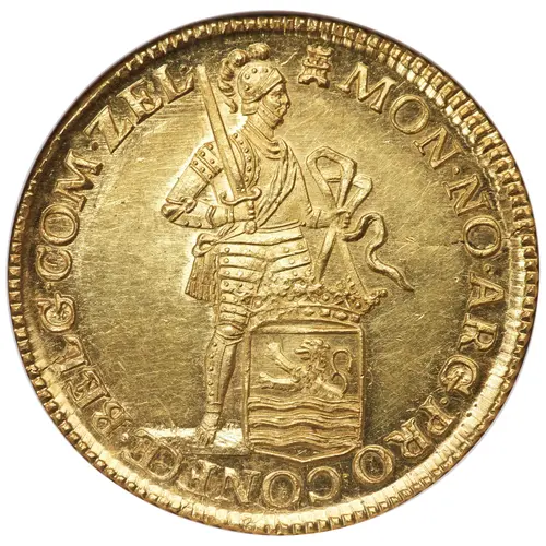Obverse description Knight in armor standing to right, holding sword in right hand against shoulder and ribbon in left hand, a crowned shield with arms of Zeeland at his feet.
