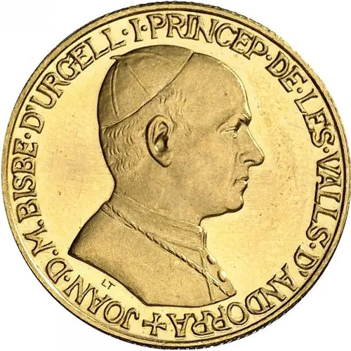 | Obverse lettering | JOAN · D. M. BISBE · D`URGELL · I · PRINCEP · DE · LES · VALLS · D`ANDORRA LT (Translation: Joan D.M. Bishop of Urgell and Prince of Andorra Valleys) |