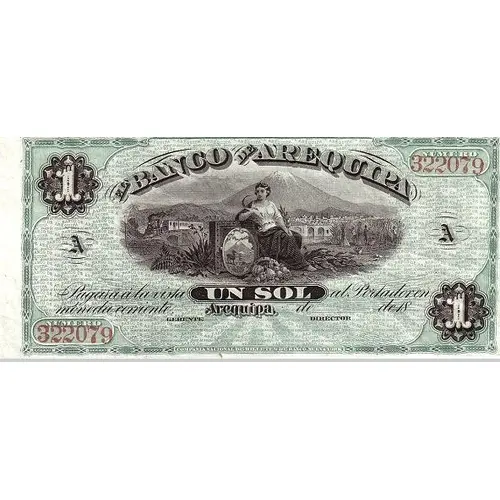 | Obverse lettering | 1 el BANCO de AREQUIPA NÚMERO 322079 A Pagará á la vista UN SOL al Portador en moneda corriente. Arequipa, __ de _____ de 18__. GERENTE DIRECTOR COMPAÑÍA NACIONAL DE BILLETES DE BANCO, NUEVA YORK. (Translation: 1 the Bank of Arequipa will pay at sight one Sol in circulating currency. Arequipa, ____ __th., 18__ Manager, Director National Bank Note Company, New York.) |