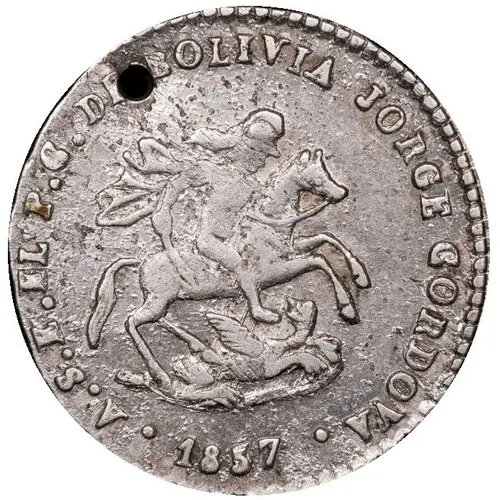 | Obverse lettering | A. S. E. EL P. C. DE BOLIVIA JORGE CORDOVA. 1857 (Translation: To his Excellence, the Constitutional President of Bolivia, Jorge Córdova. 1857) |