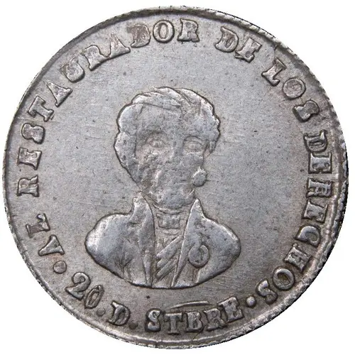| Obverse lettering | .AL RESTAURADOR DE LOS DERECHOS. 20.D. STBRE (Translation: To the Restorer of the Rights) |