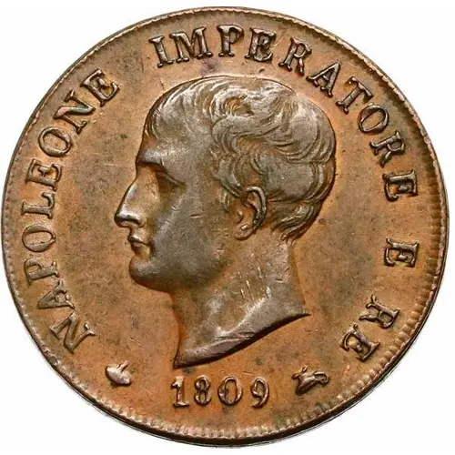 | Obverse description | Head of Napoleon on the left under the legend `NAPOLEONE IMPERATORE E RE`, above the vintage. |