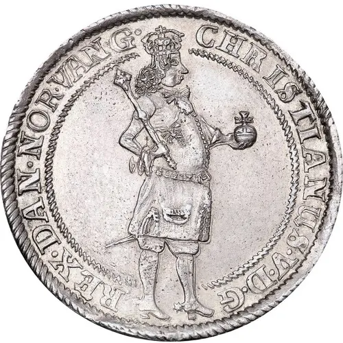 | Obverse description | Standing figure of King Christian V with long armored rope. King is holding a raised scepter (or a mace) in his right hand and a globus cruciger in outstretched left hand. This pose is similar to those of krone and first speciedaler from Christian IV |