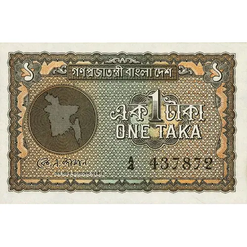 Signature(s) Finance Secretary, Government of Bangladesh Reverse Guilloche patterns and numeric 1 writing in bengali on center. Lettering: গণপ্রজাতন্ত্রী বাংলাদেশ PEOPLE`S REPUBLIC OF BANGLADESH এক টাকা ONE TAKA