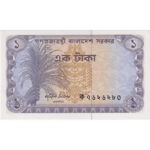 | Reverse lettering | গণপ্রজাতন্ত্রী বাংলাদেশ সরকার এক টাকা (Translation: GOVERNMENT OF THE PEOPLE`S REPUBLIC OF BANGLADESH ONE TAKA) |