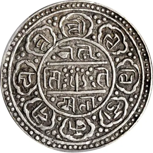 | Obverse description | Undeciphered Ranjana characters surrounded by more characters within the petals of an eight-petalled lotus. |