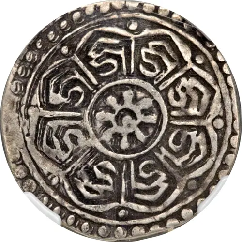 | Obverse description | Wheel within single circle surrounded by Vartula characters within the petals of an eight-petalled lotus. |
