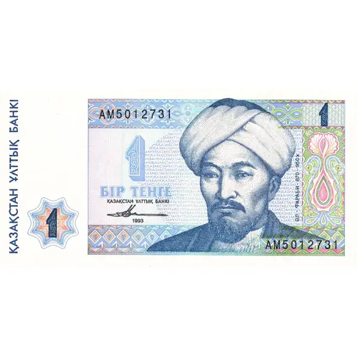 ҚАЗАҚСТАН ҰЛТТЫҚ БАНКІ 1 БІР ТЕҢГЕ ҚАЗАҚСТАН ҰЛТТЫҚ БАНКІ 1993 ӘЛ - ФАРАБИ - 870–950ж (Translation: National Bank of Kazakhstan, One Teñge, National Bank of Kazakhstan, Äl-Farabï - year 870-950) |
