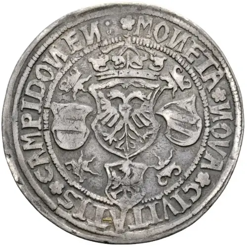 Crowned shield with imperial eagle, 3 small shields of Austria, Burgundy and Tyrol at left, right and bottom, date at end of legend. |