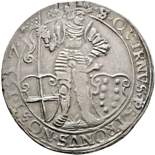 | Obverse description | Full-length facing armored figure of St. Quirin holding standard, ornately shaped shields of Cologne and Neuss to left and right of legs, date at end of legend. |