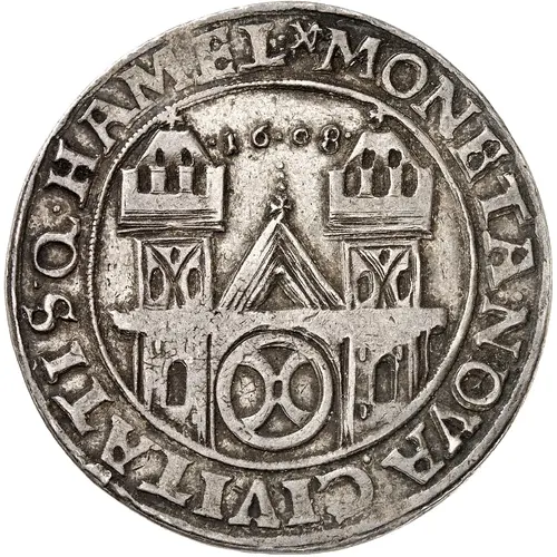 | Obverse description | Church with 2 towers, date between towers, city arms in entrance below. |