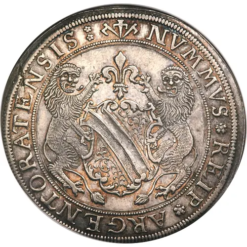 | Mô tả mặt trước | Rms of the Free Imperial City of Strasburg with lions as supporters in a circle. |