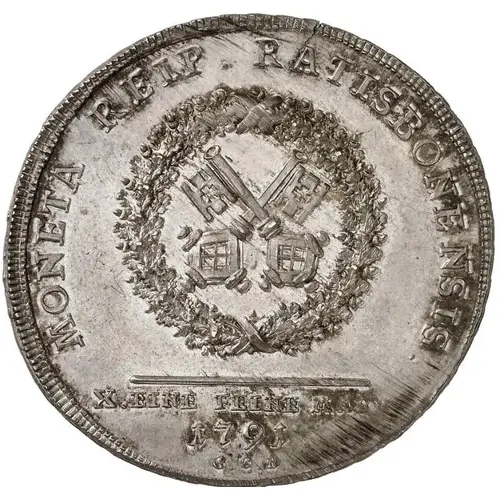 | Obverse lettering | MONETA REIP. RATISBONEENSIS., X. EINE FEINE MARK/1791/G.C.B. |