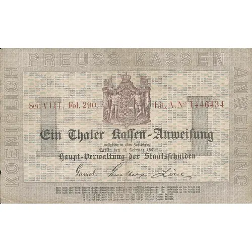 KOENIGLICH PREUSS. KASSEN ANWEISUNG Ein Thaler Kassen-Anweisung vollgültig in allen Zahlungen Berlin, den 13. Februar 1861 Haupt-Verwaltung der Staatsschulden |