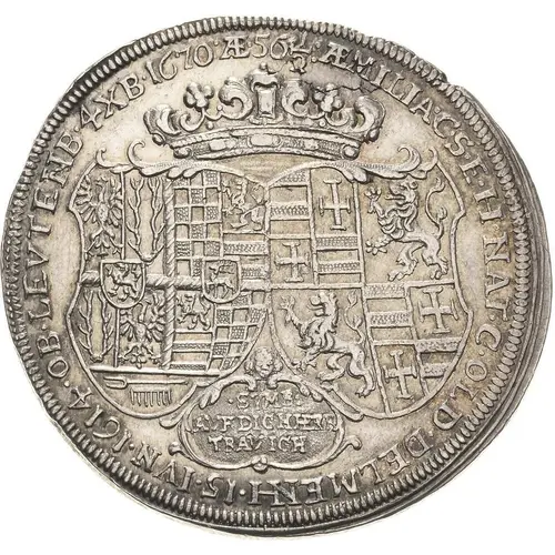 | Opis líce | AEMILIA C S E H NAT C OLD DELMENH 15 IVN 1614 OB LEVTENB 4.XB.1670 AE.56 1/2 SYMB AVF DICH HERR TRAV ICH |