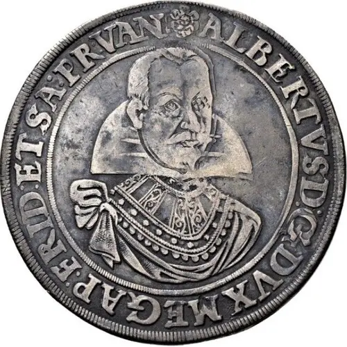 Ön yüz açıklaması Armored and draped bust of Albrecht von Wallenstein looking 1/4 right, legend around a finely beaded inner circle. Legend (starts 12h) around.