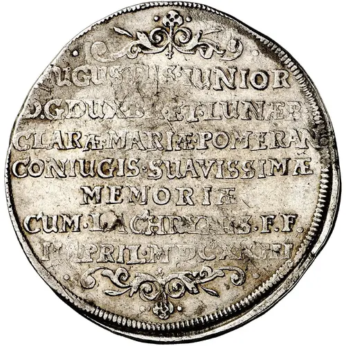 | Reverse description | Panel with 5-line inscription in center, skull and hourglass above, dates in legend. |