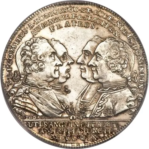 S • R • I • COMITES • A • KÖNIGSEGG • ET • ROTTENFELS • KOMINI • IN / AULENDORF • & STAUFFEN • / FRATRES • in exergue; UTI• SNAGUINE• ITA • ET • / AMICITIA • IUNCTI • / M • D • C • C • L • IX • |