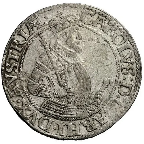 | Obverse description | Half sized armoured crowned portrait of Karl II of Habsburg facing right in a twisted circle. The crown divides the circle. |