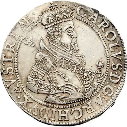 | Obverse description | Half sized armoured crowned portrait of Karl II of Habsburg facing right in a beaded circle. The crown divides the circle. |