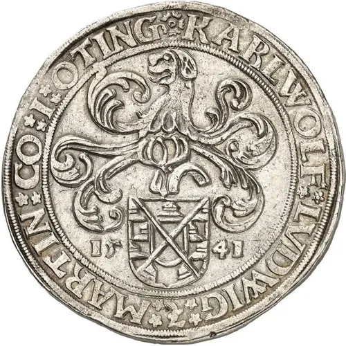 | Obverse description | Shield of Öttingen arms divides date, ornate helmet with dog`s head crest, titles of 3 counts |