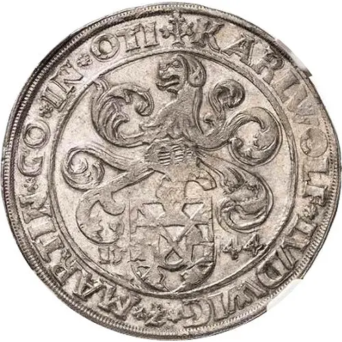 | Obverse description | Shield of Öttingen arms divides date, ornate helmet with dog`s head crest, titles of 3 counts. |