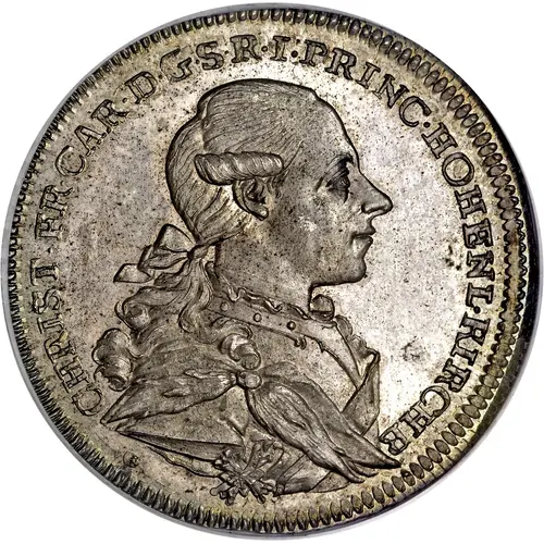 Artistry: The artistic execution of this Thaler aligns with the transitional late Baroque and emerging Neoclassical styles prevalent in German mints of the late 18th century. While a specific engraver's signature is typically absent on Hohenlohe-Kirchberg issues, the craftsmanship would have been executed by skilled mint masters. The obverse likely features a dignified bust of Count Christian Frederick Charles, rendered with precise detail in contemporary attire, while the reverse would display the elaborate, multi-quartered Hohenlohe arms, often crowned and flanked by supporting elements, all within a meticulously rendered legend.
