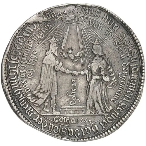 | Obverse description | Prince Friedrich standing right, clasping hands with Magdalena Sybilla standing left; dove and radiant Tetragrammaton above |