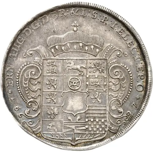 Artistry: The design is characteristic of late 17th-century German Baroque numismatic art. While the specific engraver is often unrecorded, the style features a detailed, often laureated and draped, bust of Ernest August on the obverse, conveying regal authority. The reverse typically displays the elaborate ducal, or electoral, arms, frequently surmounted by an electoral cap, surrounded by intricate heraldic elements and legends. The overall aesthetic emphasizes dynastic power and legitimacy through precise execution.