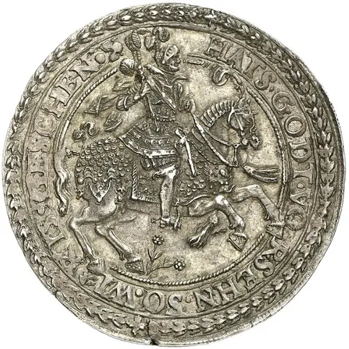 Count in full armour, holding command batton on horseback to the right. |