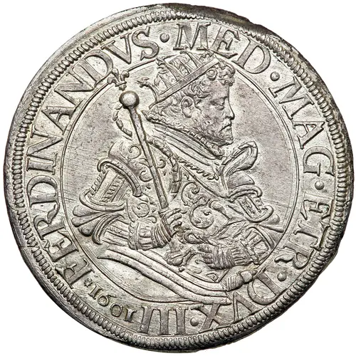 Artistry: The Thaler's design exemplifies the late Renaissance style prevalent in the Medici court, transitioning towards early Baroque. While specific engravers are not always known, the court employed highly skilled artists. The obverse typically features a dignified, idealized bust of Ferdinand I, rendered with realism yet conveying sovereign gravitas. The reverse commonly displays the elaborate Medici coat of arms, often surmounted by a ducal crown, reflecting the family's immense power and dynastic pride.