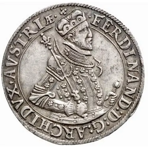 | Obverse description | Half portrait of Ferdinand II, Archiduke of Further Austria and Tirol with armour holding sceptra and sword. The top of the head breaks the circle. 2 lines of ornaments on the armour. A 3 shape at left shoulder. |