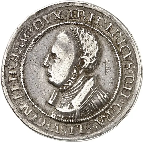 FREDERICVS • DEI • GRA • SLESVICEN • ET • HOLSAC • DVX (Translation: Frederick, by the Grace of God, Duke of Schleswig and Holstein.) |