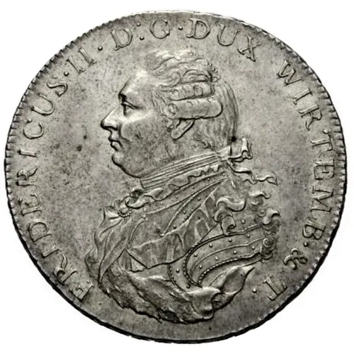 Artistry: The coin's design exemplifies the transition from late Baroque grandeur to early Neoclassical restraint. While the specific engraver for this die is often unrecorded, the Stuttgart mint's chief engraver would have been responsible, influenced by contemporary European medalists. The obverse typically features a dignified bust of Duke Frederick II, often facing right, rendered with classical precision in the drapery and a regal expression. The reverse prominently displays the crowned ducal arms of Württemberg, frequently quartered, symbolizing the duchy's territorial claims.