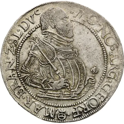 MO NO ARG GEOR F // MAR BRAN Z SL DVC (Translation: Moneta Nova Argentea Georgii Friderici Marchionis Brandeburgensis et Silesiae Ducis) |