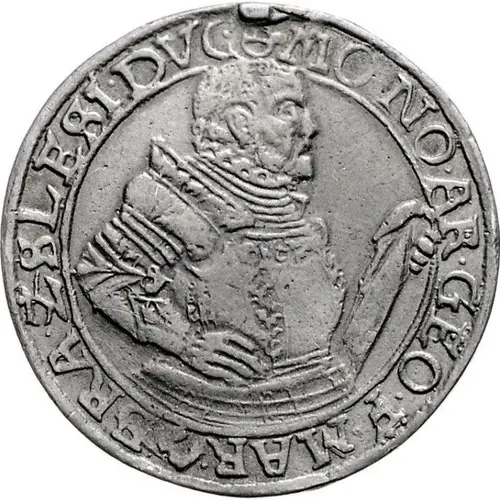 | Reverse description | Coat of arms of the Teutonic Order (floriated cross formed by four pillars with eagle on escutcheon in the center). In the four quadrants divided by the cross, the coat of arms of Georg Friedrich split on German escutcheons, clockwise: quartered sable and argent Hohenzollern arms, crowned rampant lion of Ansbach, Griffin of Pomerania, Red Eagle of Brandenburg. Legend around a beaded inner circle with date at the end. |