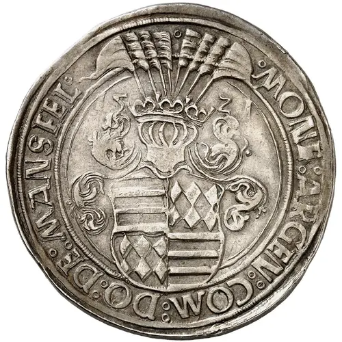 | Obverse description | 4-fold arms of Mansfeld, ornate helmet above divides date. |