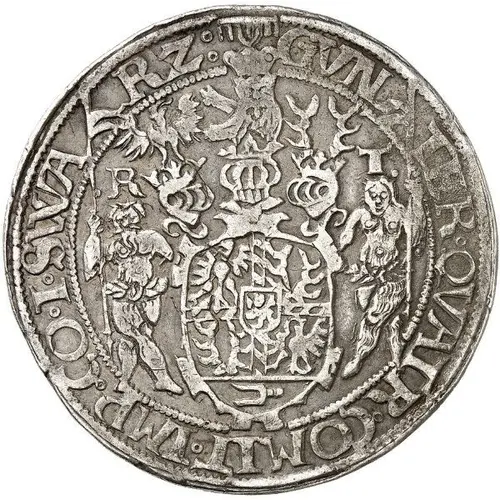 | Descrizione del dritto | Oval shield of 4-fold arms with central shield of Schwarzburg, supported by wildman and woman holding pennants, 3 ornate helmets aboe, R - T (Reichstaler) divided by helmets above supporters. |